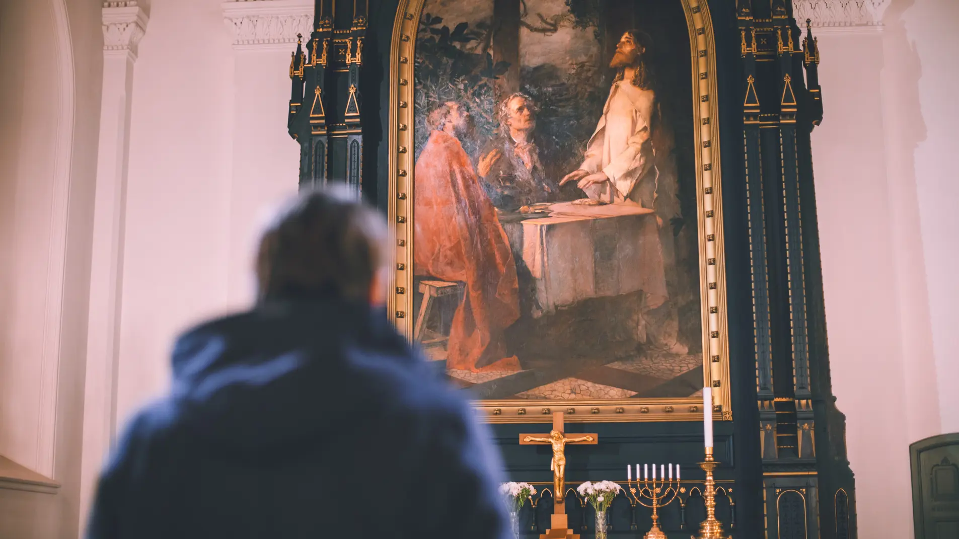 Til tonene av en øvende organist nærmer vi oss en konklusjon. Nils Terje snur seg mot altertavlen. Den ble malt i 1886, av Eilif Peterssen, som også malte Henrik Ibsen og Arne Garborg.